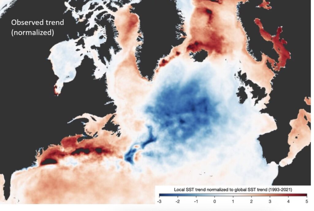 Það er að stór svæði Atlantshafsins kólni um 4 til 6 gráður sem og belti undan austurströnd Norður-Ameríku hlýni um það sama þegar Golfstraumurinn færist norðar.
